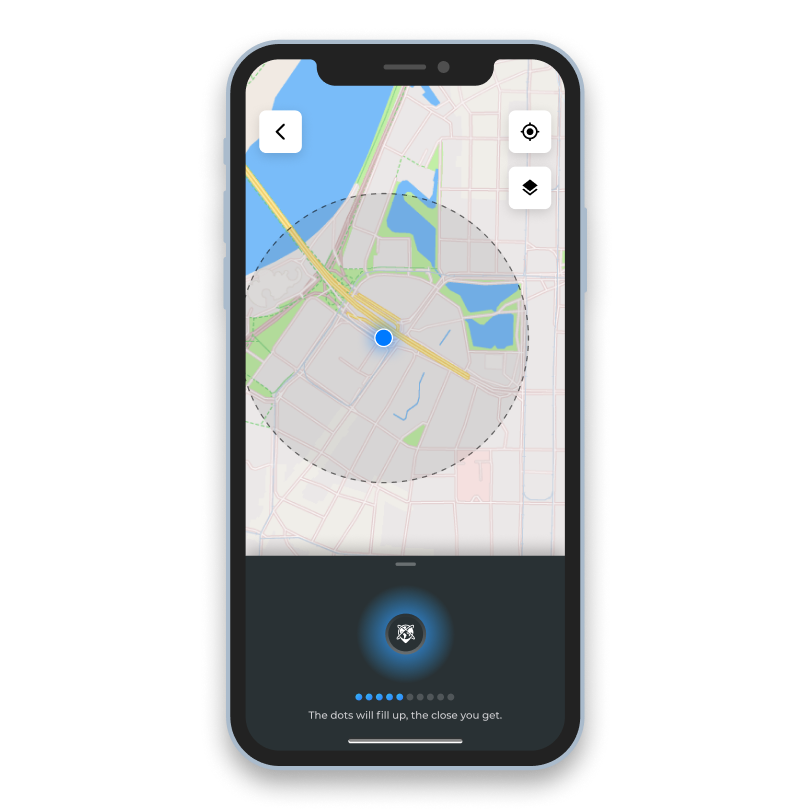 Go out and start your treasure hunt. The app helps you to find the boxes in your city. Whenever you see the blue dotted scale filling up, you are getting closer and closer.